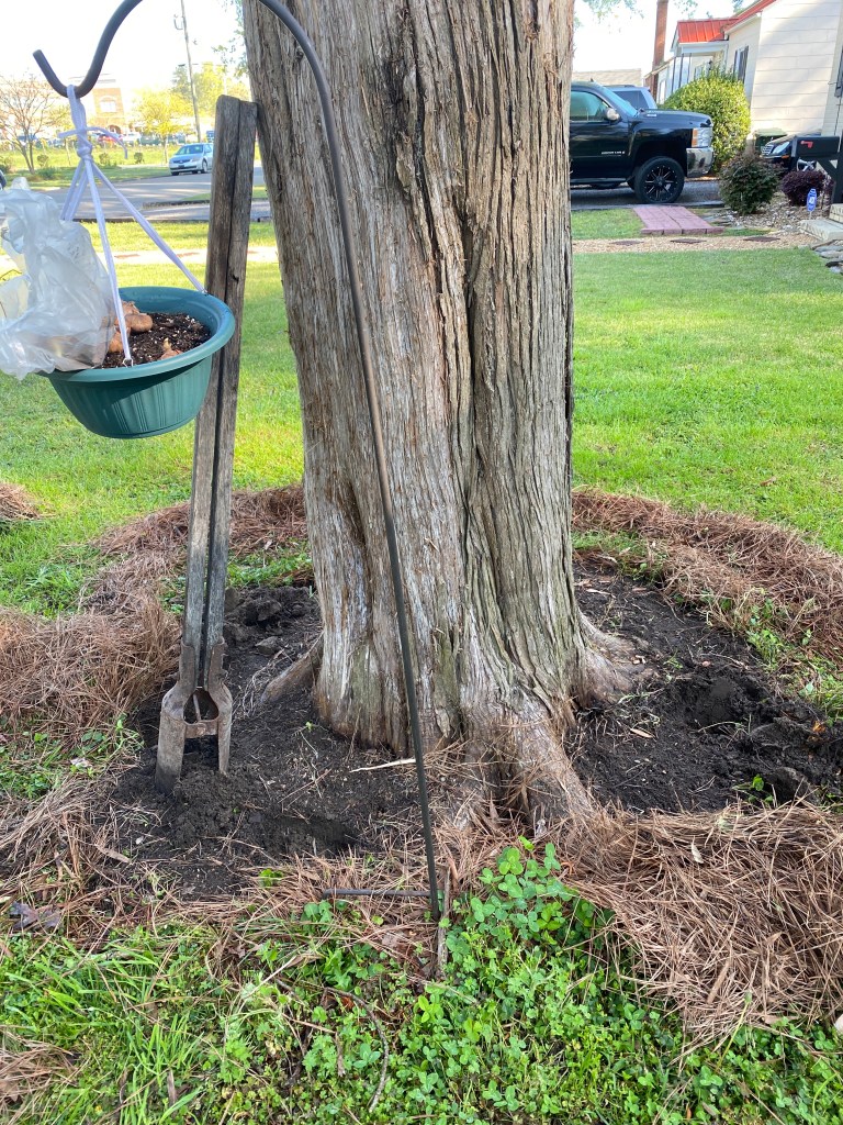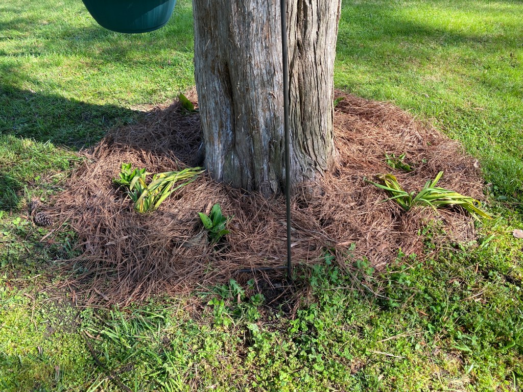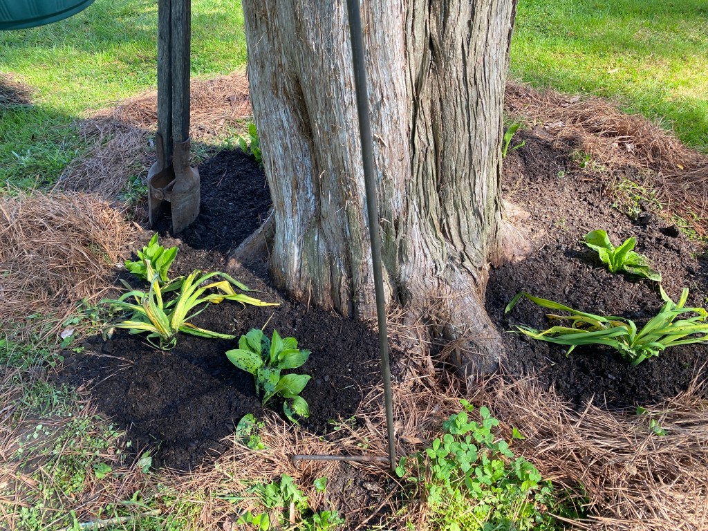 Today’s project: plant hostas, day lilies, morning glory seeds and gladiolus bulbs around this tee in my yard.The first steps are to clear away the grass and straw. Then dig holes and drop in the plants and bulbs.I added miracle grow garden soil and plant food to give my plants, bulbs and seeds a healthy start.I placed the straw back around the flowers to add some insulation. Stay tuned to see what the summer brings!