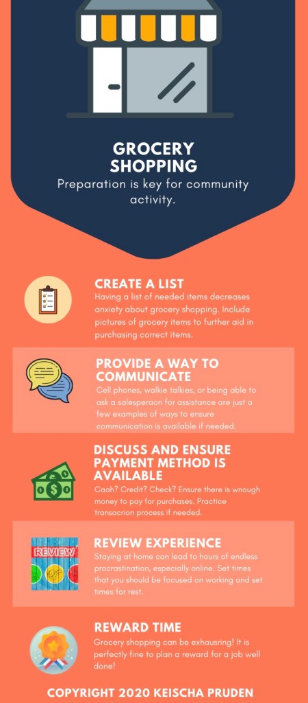 I asked Aaron to do a little grocery shopping today. Over time, we have developed a game plan to help Aaron have successful community outings. In this instance, Aaronβs grocery shopping was successful because we were able to: