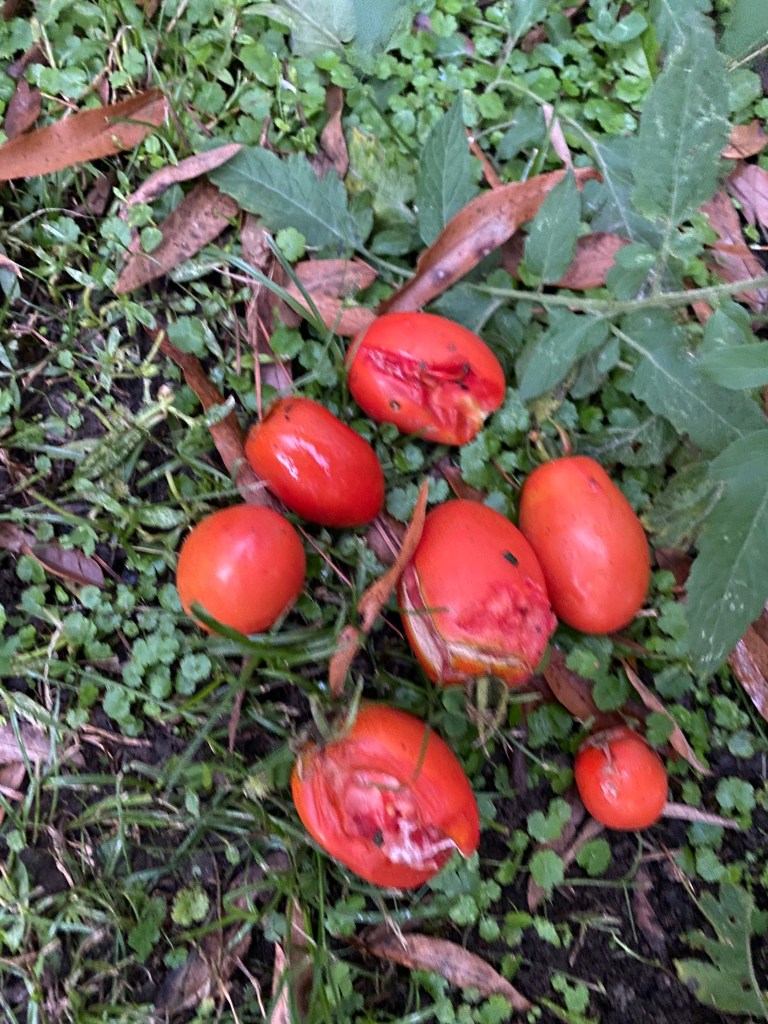 I lost more tomatoes than I harvested this morning. I saw them hanging on the vine but figured I had more time.