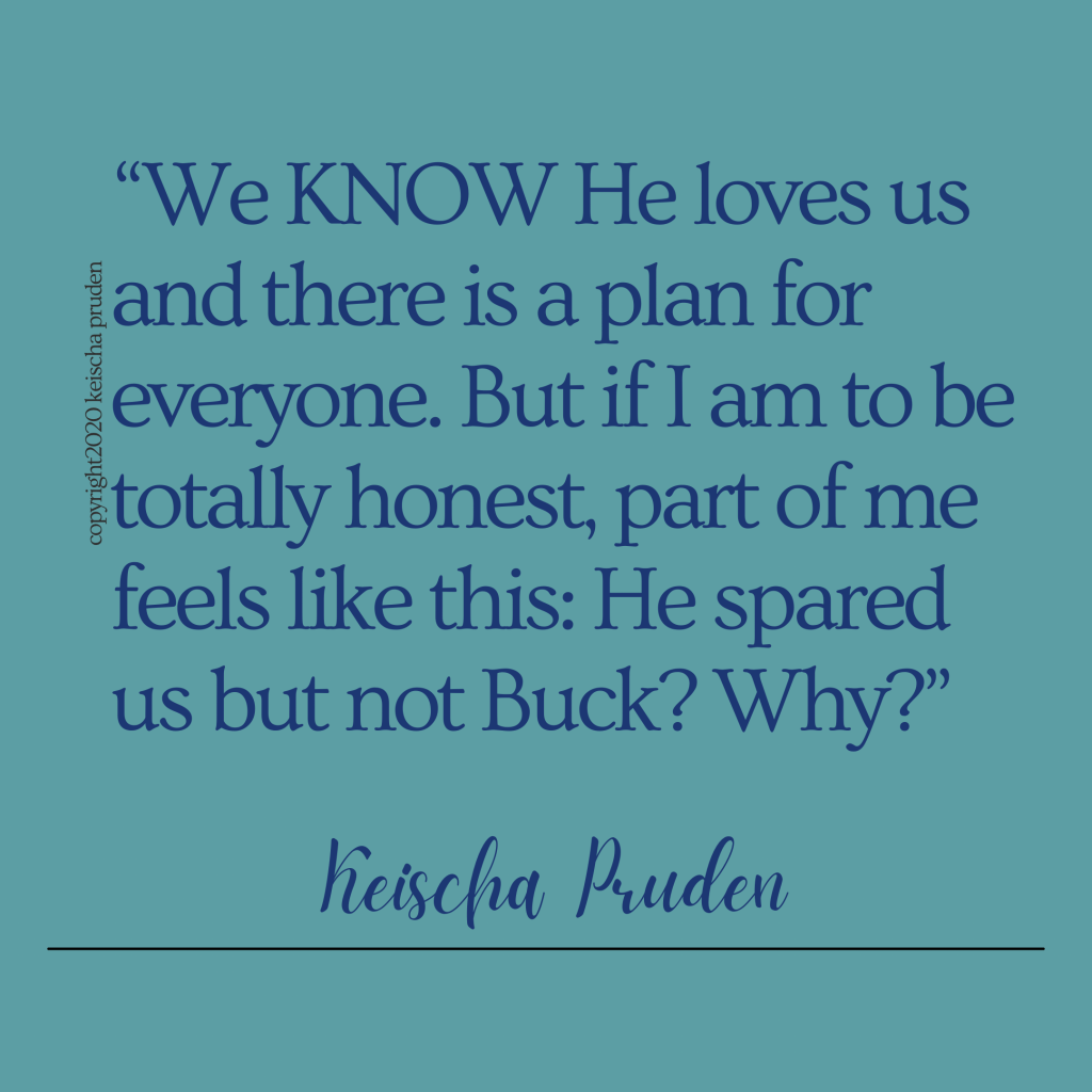 We are stunned and in disbelief. As people of Faith, we love our Creator. We KNOW He loves us and there is a plan for everyone. But if I am to be totally honest, part of me feels like this: He spared us but not Buck? Why?